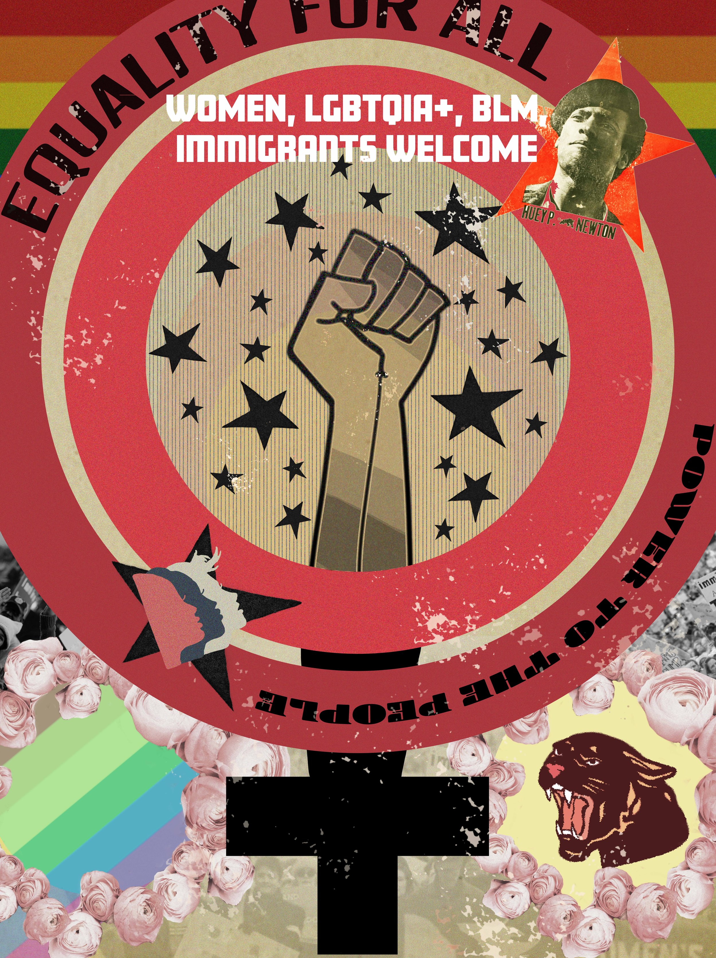 The “EQUALITY FOR ALL” Flag Design was a personal project, challenging my graphic design skills and creating a unique product that is unmet in the market: a unity-based message for marginalized groups in the form of a flag. All art was made by myself, excluding Huey P. Newton image, Pride flag image and Black Panthers image.